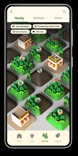 One of the key features of the app, it connects the users with composting experts, fellow compost buddies, composting communities and composting services around them using a playful map viualization. The user can easily see what people around them are doing and get inspired and motivated to themselves start adopting composting practices.